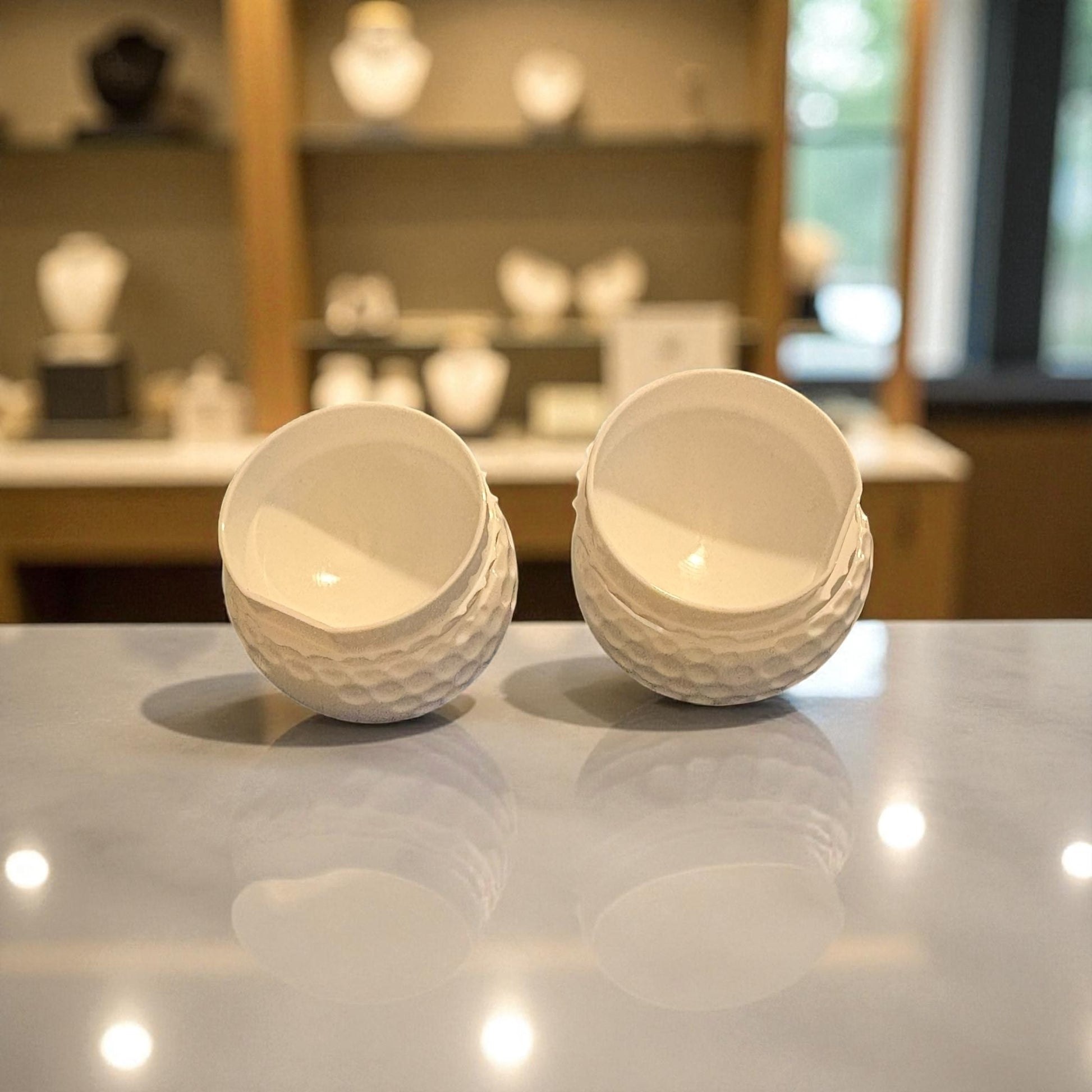 - Golf Balls Shot Cups - Two white golf balls shaped shot cups.