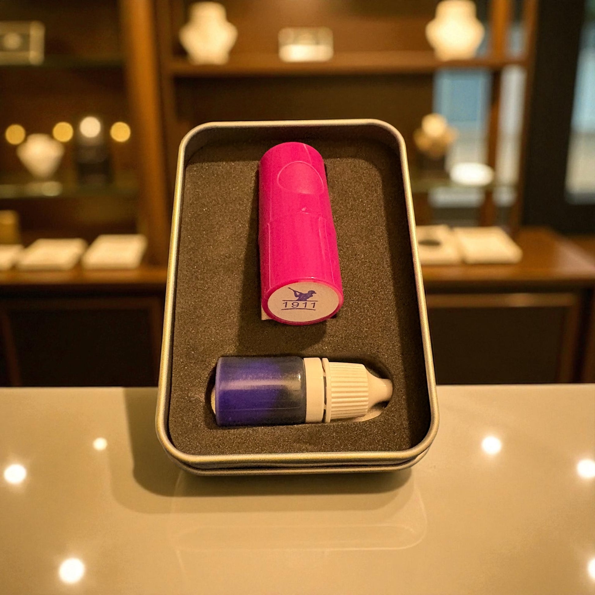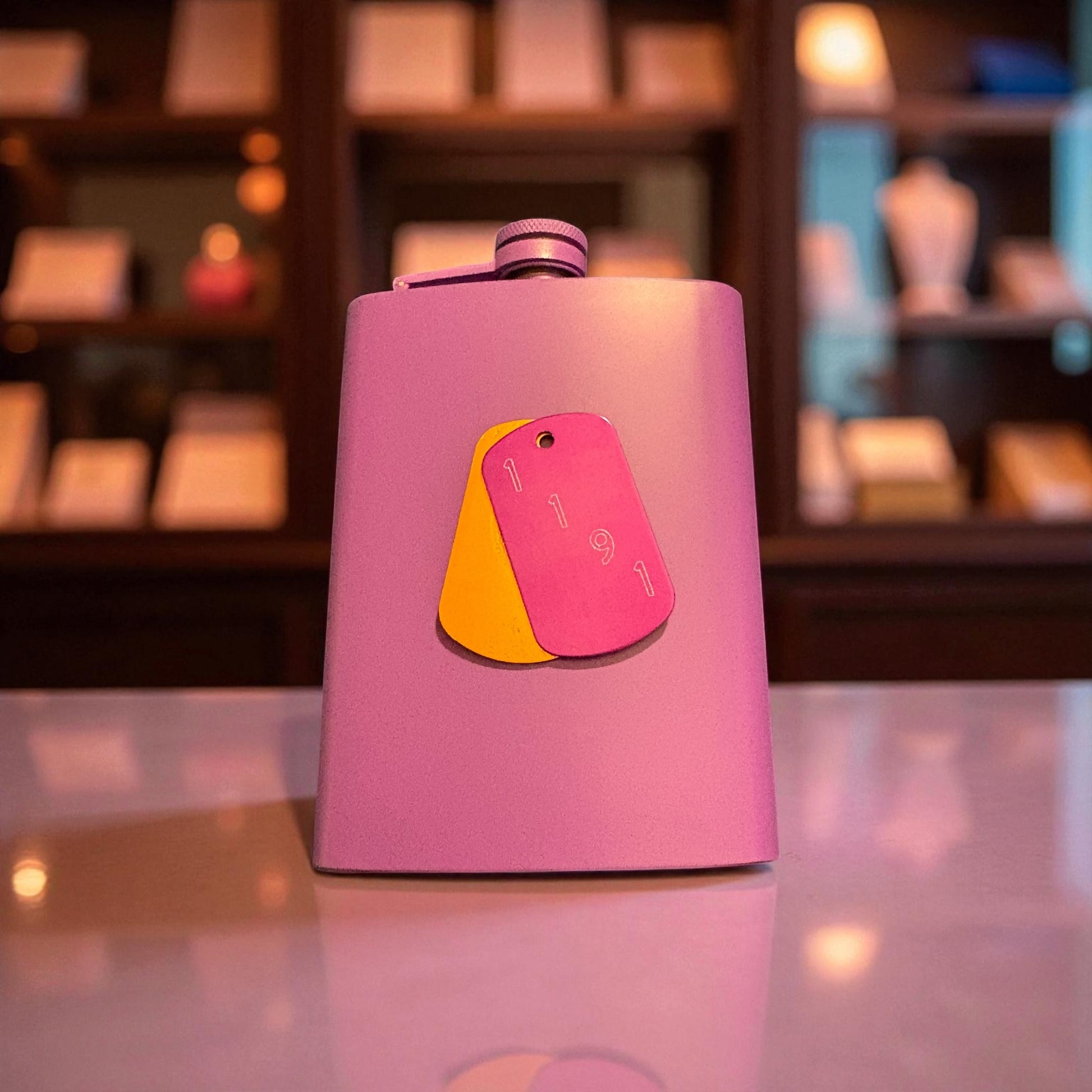 - Purple Flask - A vibrant purple flask with gold and purple "1911" tags.