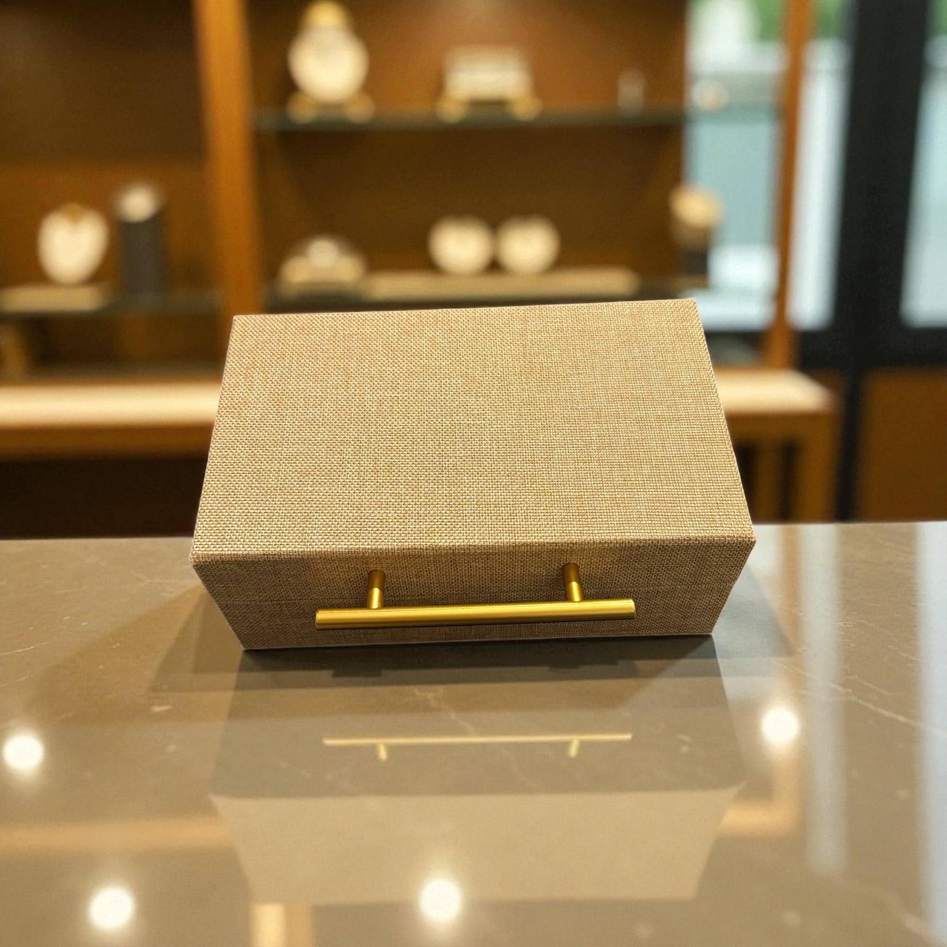 - Storage Box - A chic and durable twill box with a gold metal lining that ties the entire gift together beautifully. 10.5 x 6.5 x 4.25 inches.