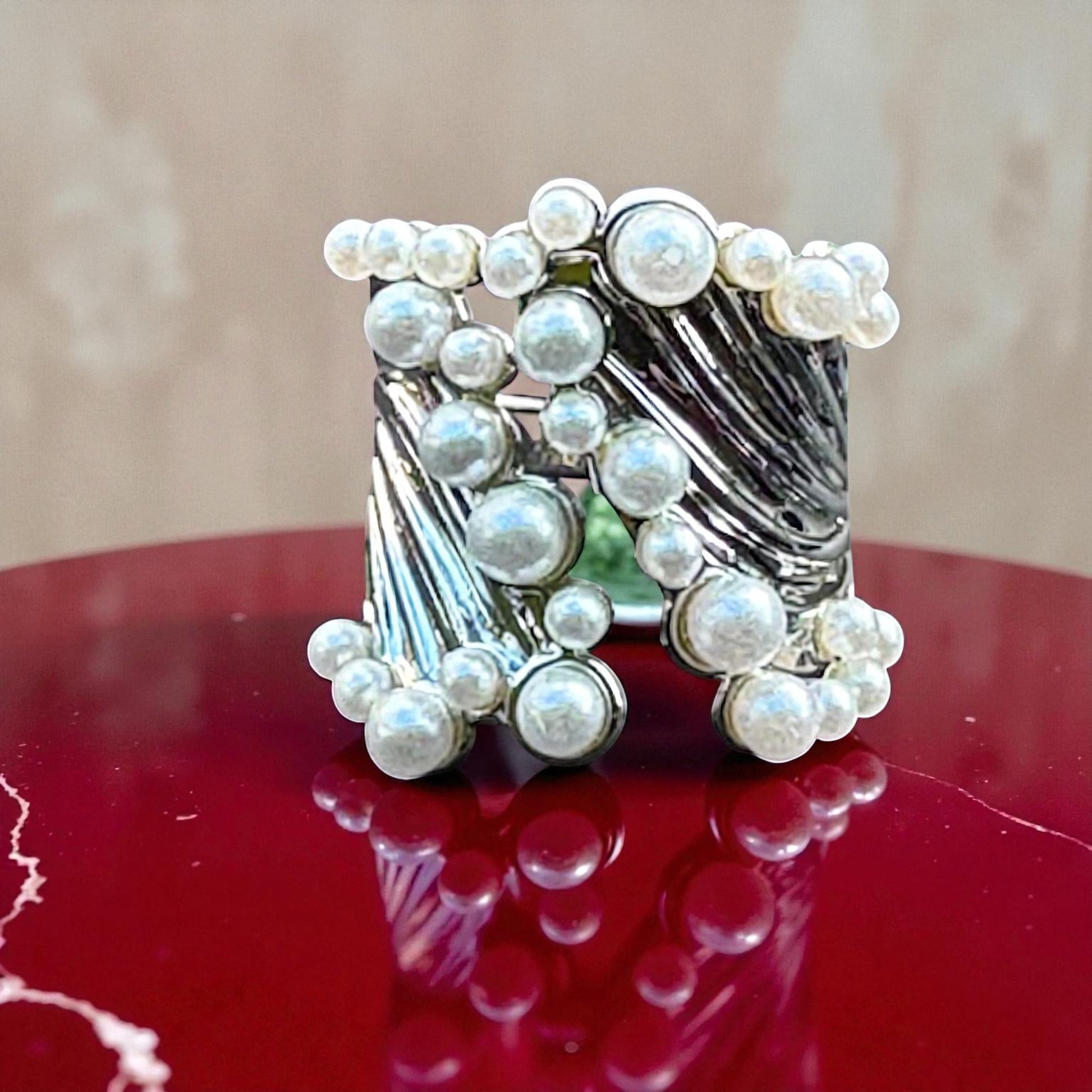 This is an adjustable metal ring with a pearl trim.