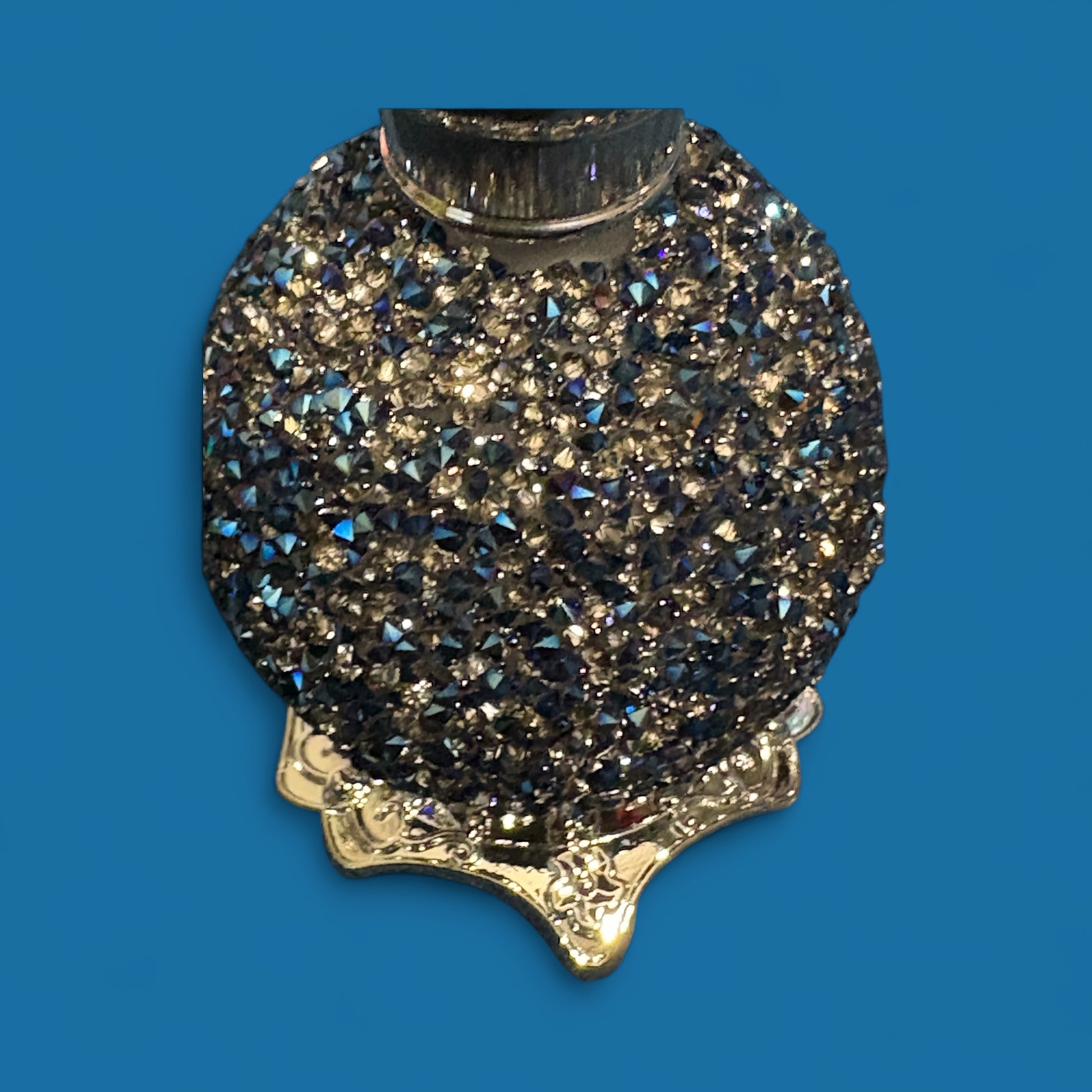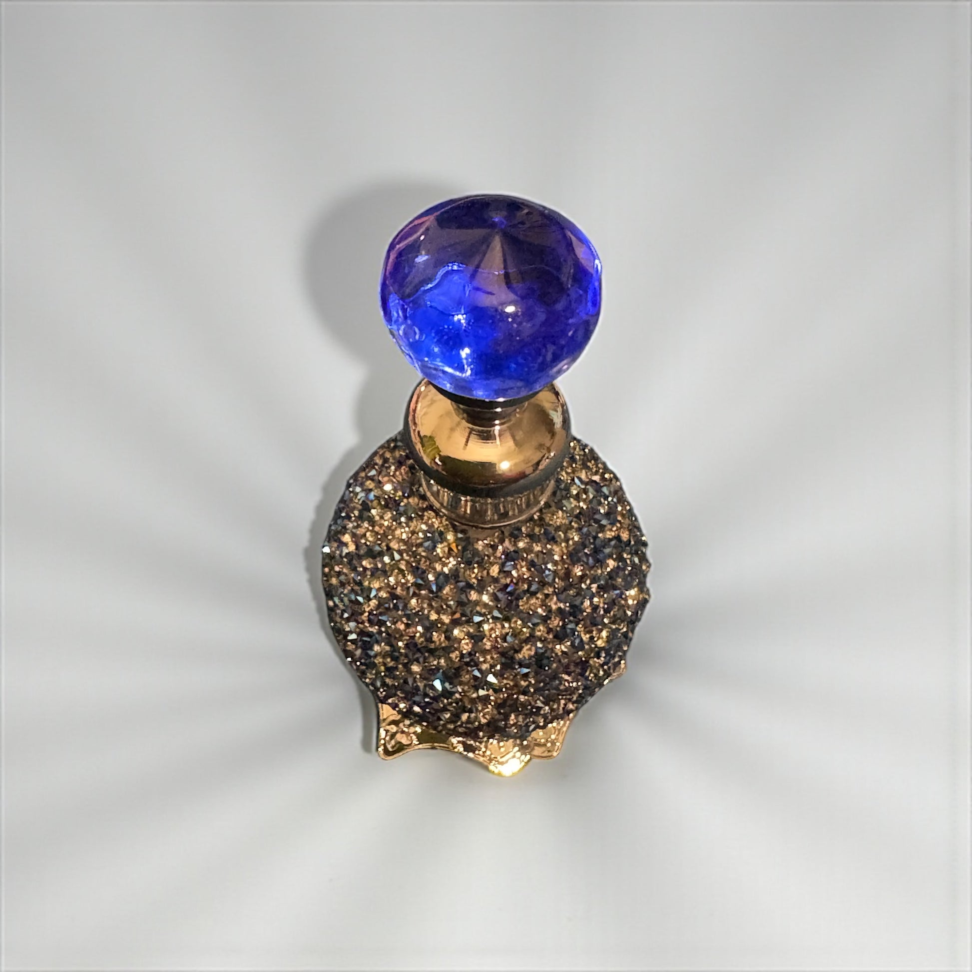 This shimmery blue empty perfume bottle is beautiful. Fill with essential oil or perfume. The lovely jewel on the top accentuates the beauty of this vintage bottle. It measures 3 inches high.
