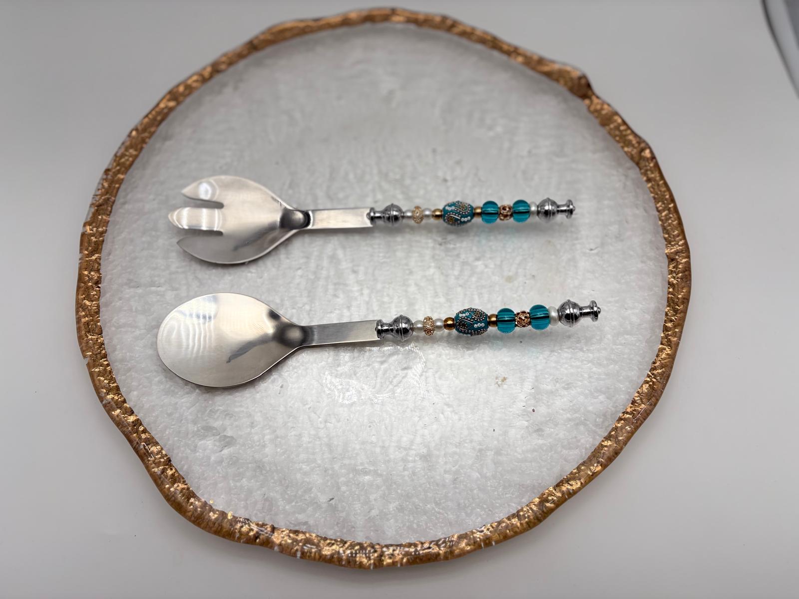 Elegant Turquoise & Gold Serving Platter with Matching Utensils – 14.25” Round Set