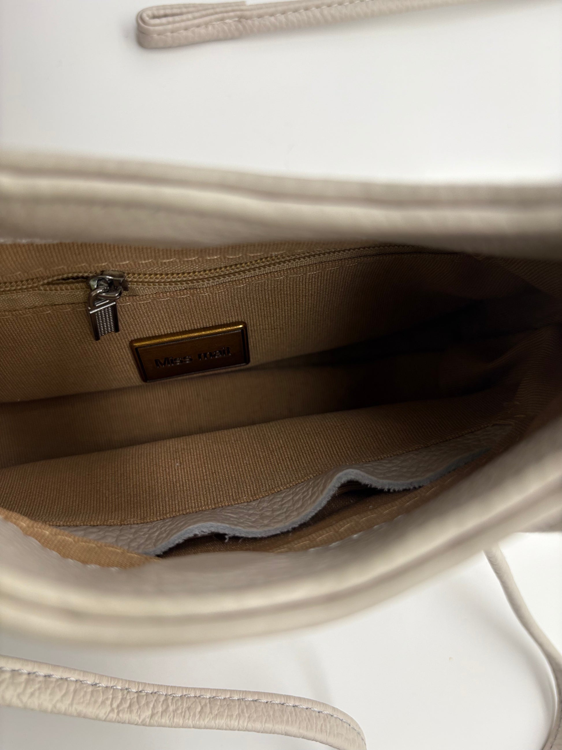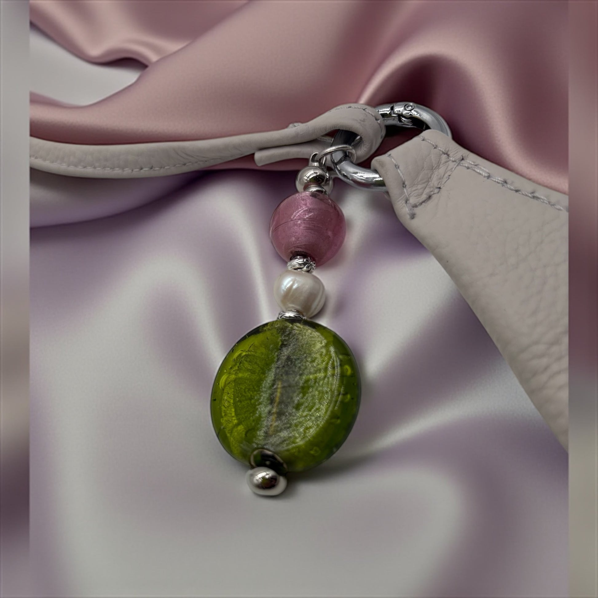Genuine leather off white purse adorned with handcrafted pink and green lampwork bead. A lampwork bead is handmade. It is created by melting glass over a flame with a torch and shaping it around a metal rod.