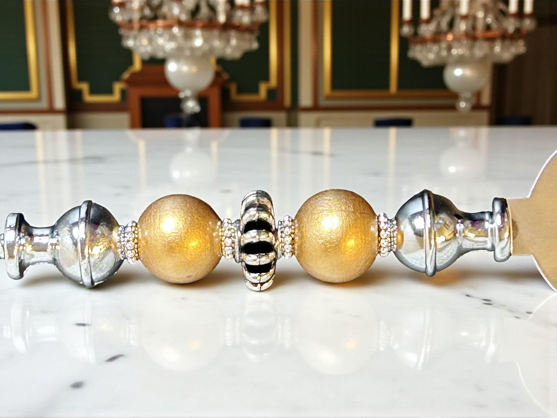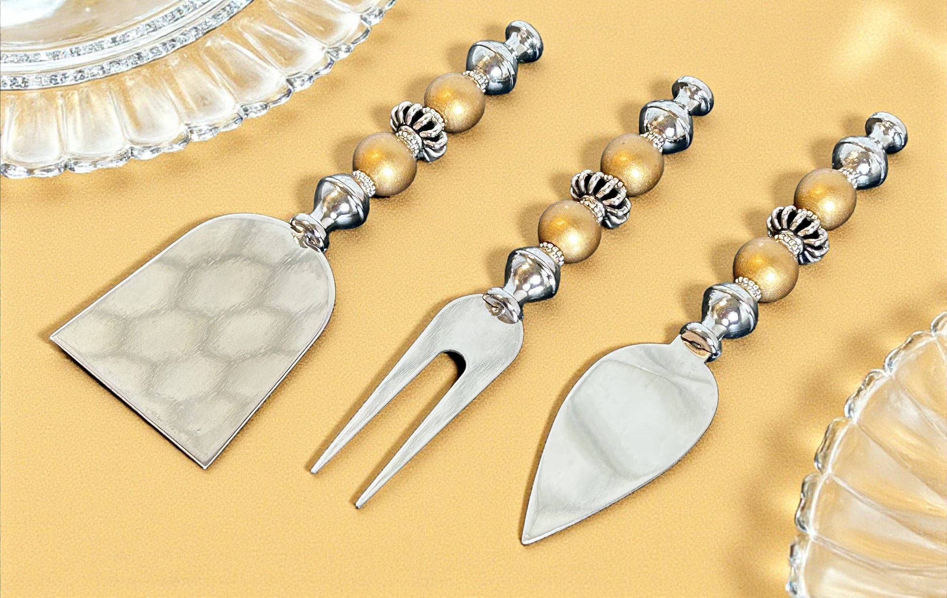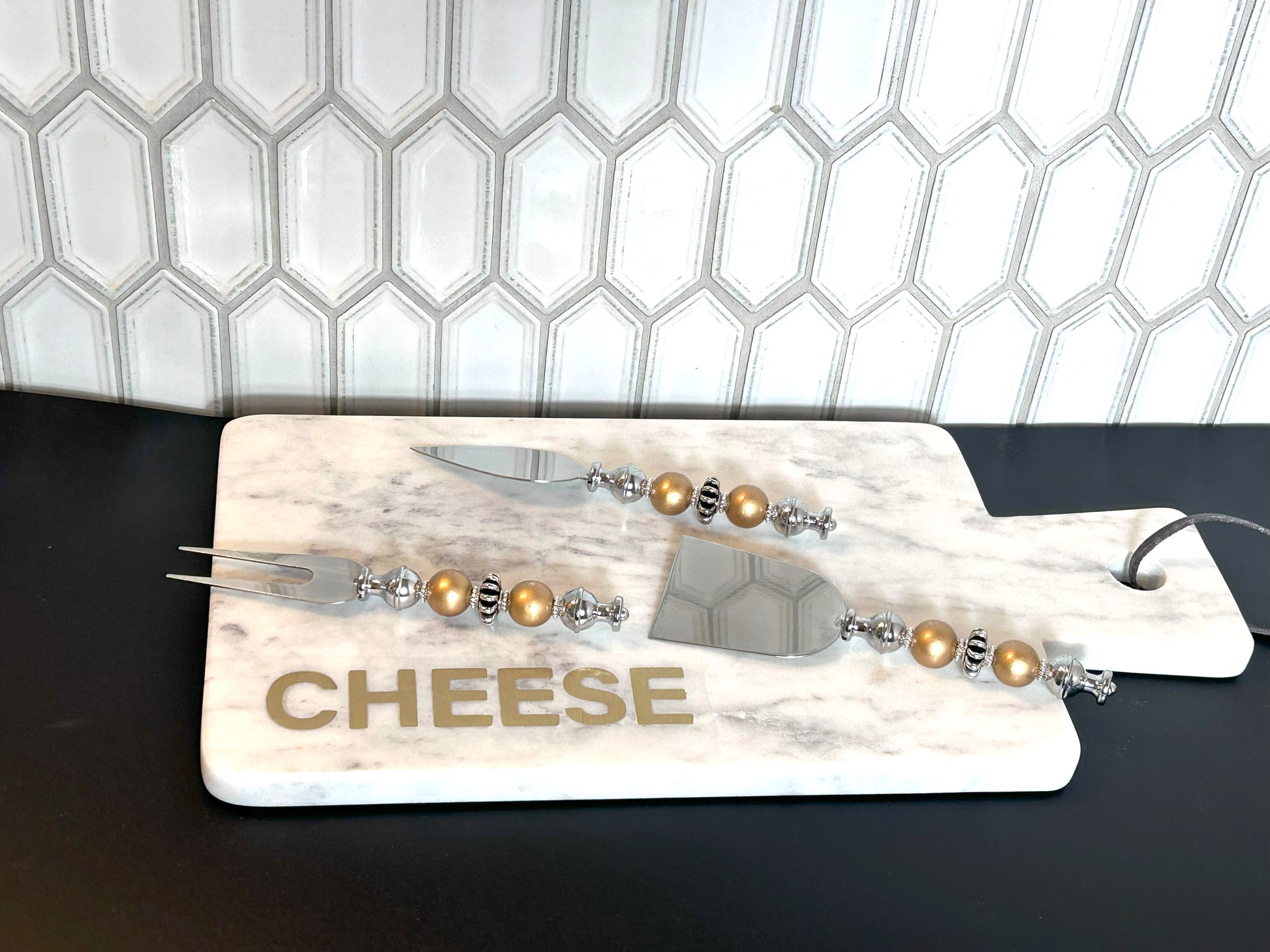 Beautiful marble cutting board and three-piece charcuterie set with wooden and metal beads.