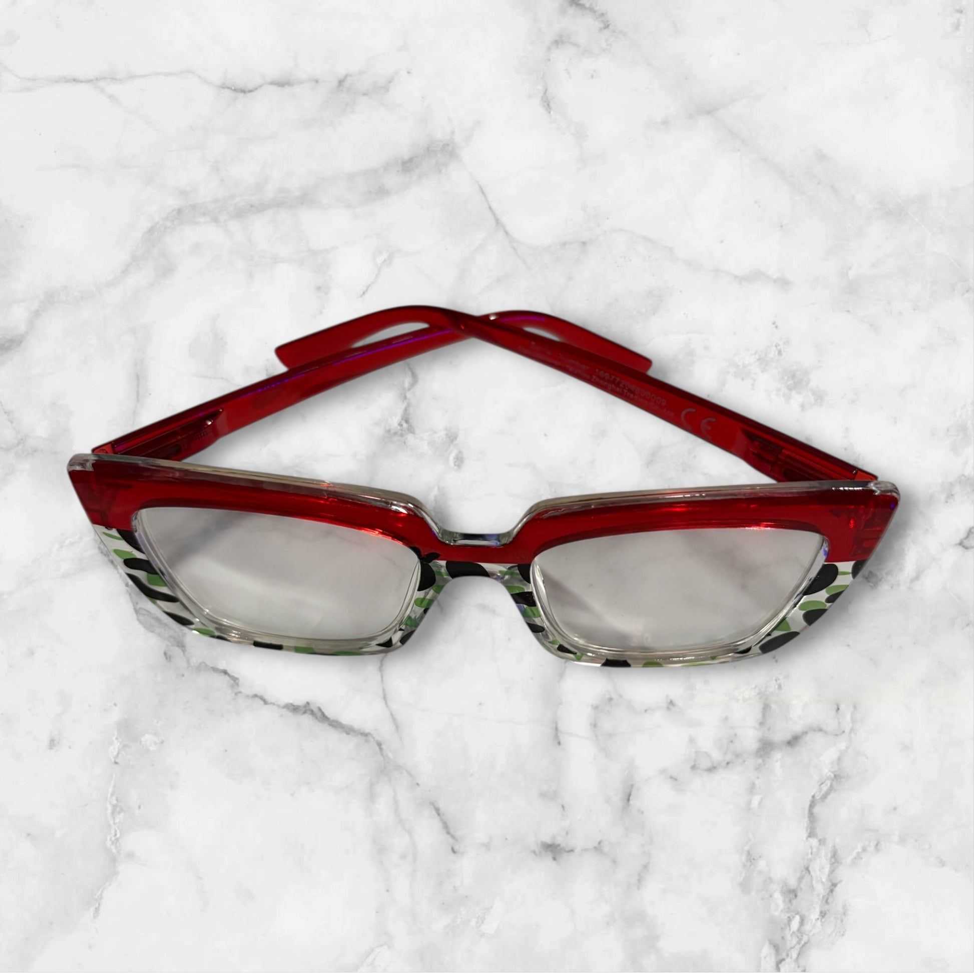 These are a pair of fierce red oversized readers with a camouflage print trim. They embody both strength and refinement. Offered in a variety of strengths.