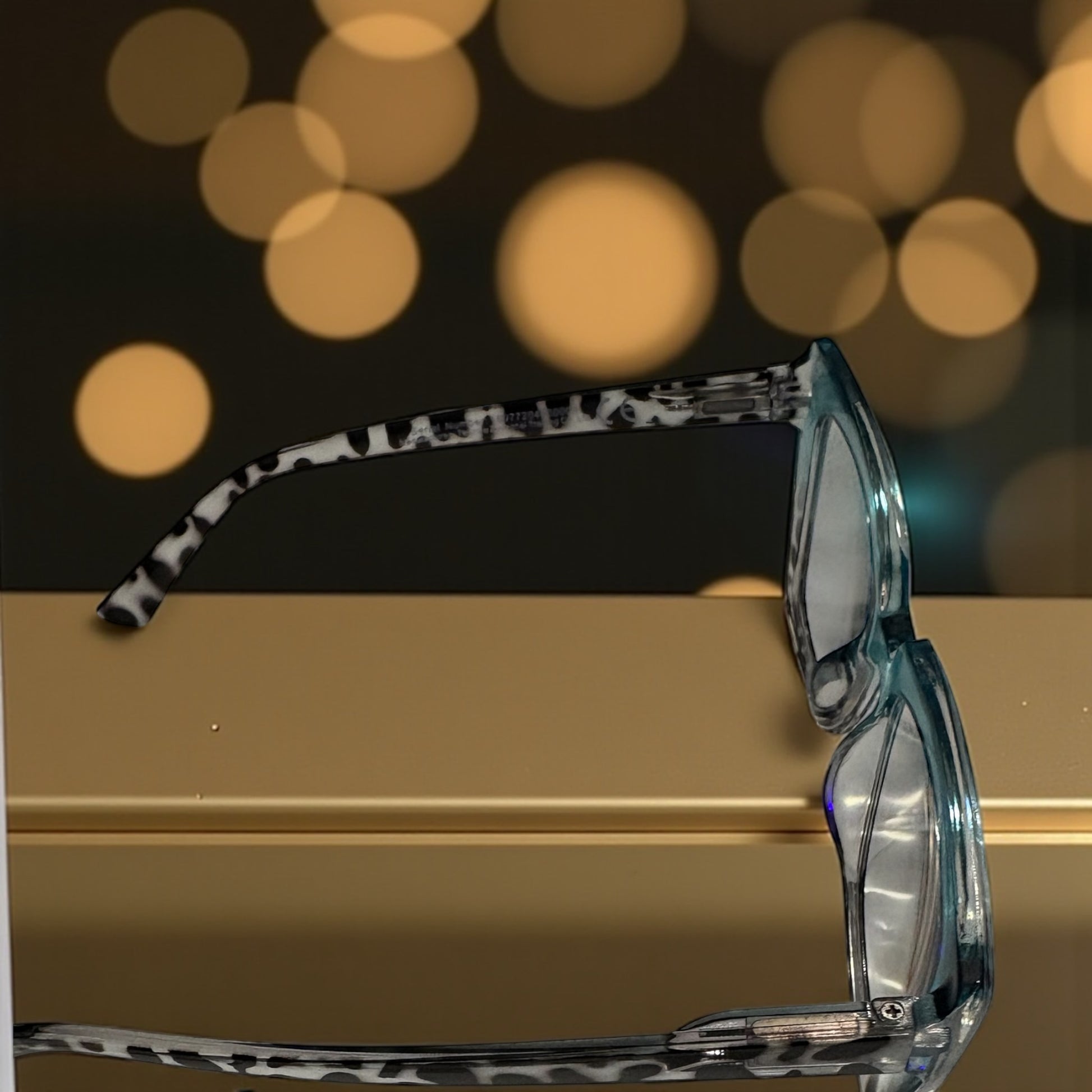 These are a pair of fierce, blue oversized readers. The top is transparent blue. The bottom trim and frame are leopard print. These bold readers make a style statement. Offered in a variety of strengths.
